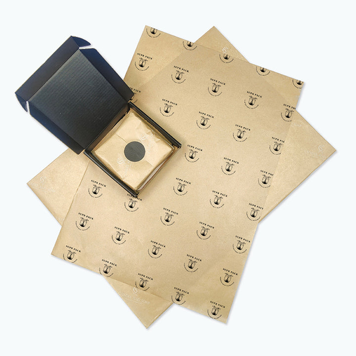 Supr Pack’s Kraft Tissues are digitally printed with soy-based ink in Pantone colors.
