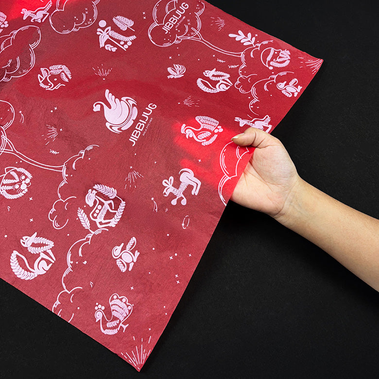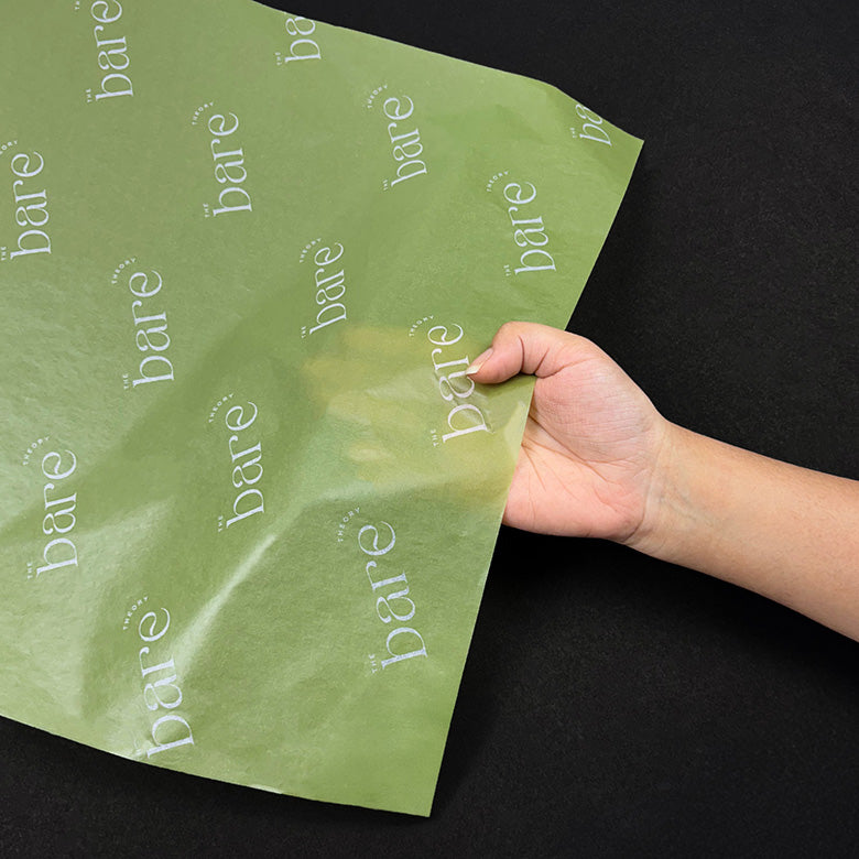 Custom Tissue is 17GSM thin and comes with a variety of color options to print. Because of the thickness of the paper, the final printed colours may appear lighter.