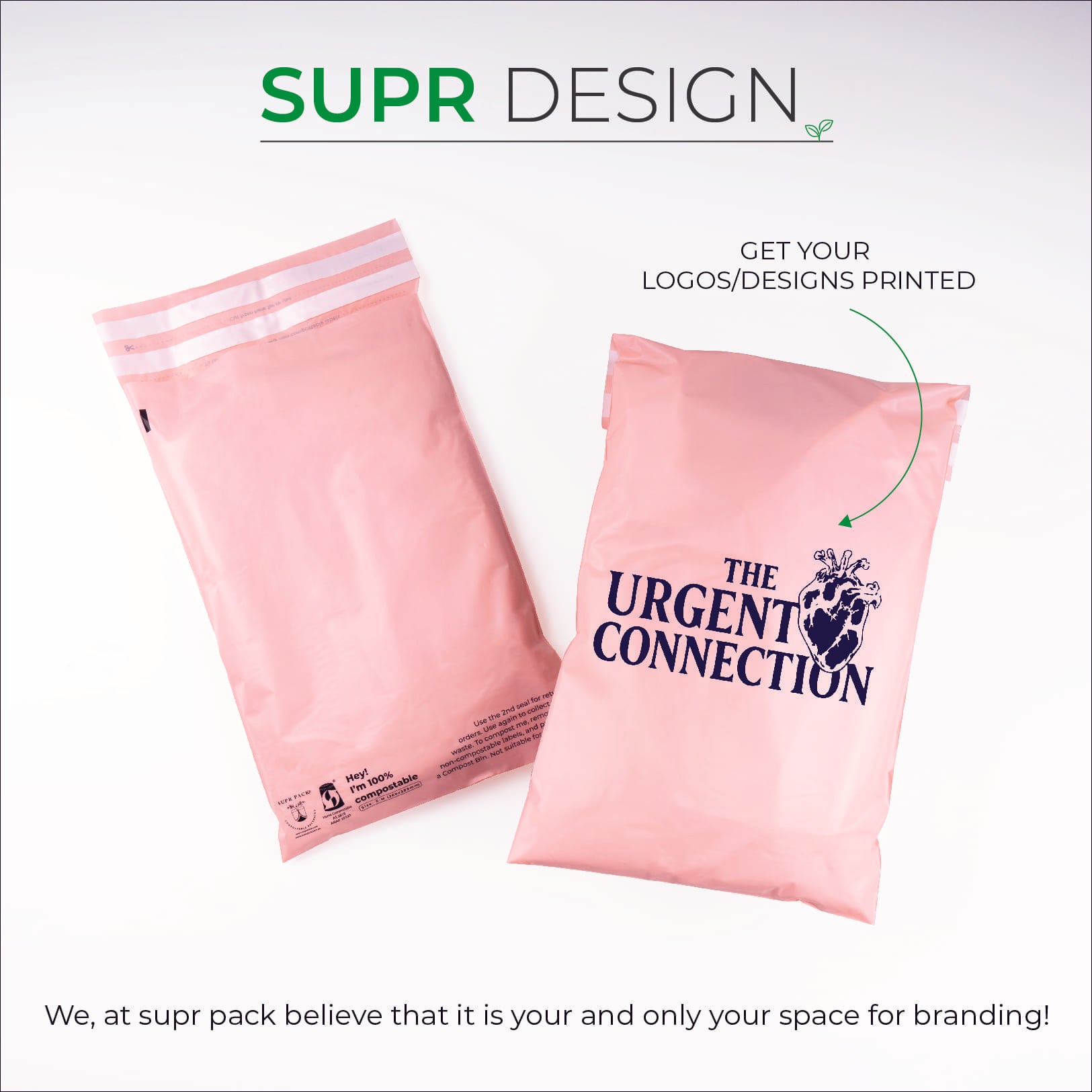 We may be able to print on the back side or 2 colour printing of compostable mailers at an additional cost. Kindly email us your design and colour codes at hello@suprpack.com.au and the team will get back to you within 48 business hours.