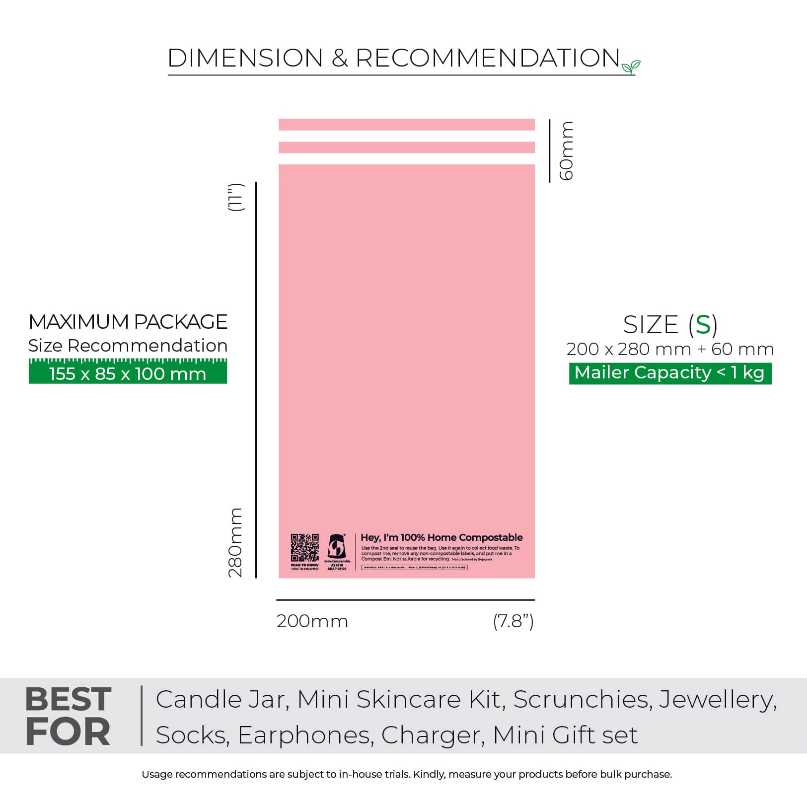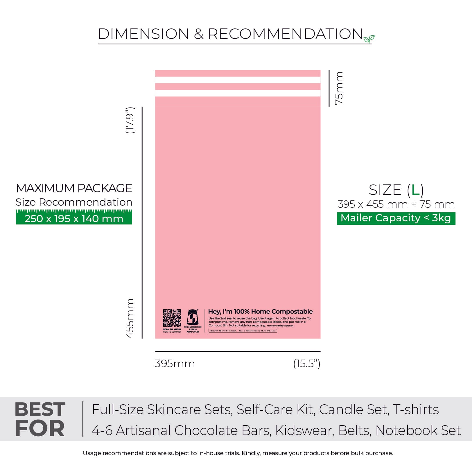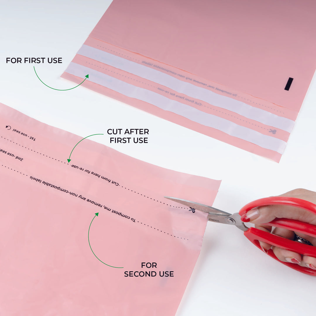 Cut along the dotted line after 1st use. Refill the compostable mailer with your product, seal & ship your order again. This reusable feature also useful for return orders.